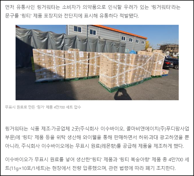 유통전문판매사 ㈜링거워터는 소비자가 의약품으로 인식할 우려가 있는 ‘링거워터’란 문구를 링티 제품 포장지와 전단지에 표시해 유통하다 적발됐다. ㈜링거워터는 식품 제조·가공업체 2곳(주식회사 이수바이오·콜마비앤에이치㈜ 푸디팜사업부문)에 링티 제품 등을 위탁 생산해 ㈜와이웰을 통해 판매하면서 허위·과대 광고했을 뿐 아니라, 주식회사 이수바이오에는 무표시 원료(레몬향)를 공급해 제품을 만들게 했다.